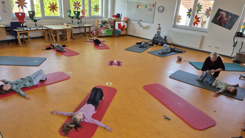 Entspannung und ein gutes Körpergefühl sind soooo wichtig! Das erfährt und genießt Klasse 2 im Moment bei einem kleinen Yoga-Projekt mit Ina Welp. Einmal in der Woche dürfen die Kinder eine Stunde lang verschiedene Übungen ausprobieren – da gibt es zum Beispiel das Krokodil, die Spinne und das Boot. Sie kräftigen und dehnen ihre Muskulatur und trainieren ihren Gleichgewichtssinn. Dabei wird besonders auf eine tiefe Atmung und Ruhe geachtet. Eine tolle Auszeit vom sonst wuseligen Schulalltag.